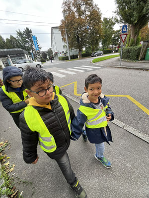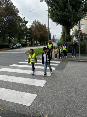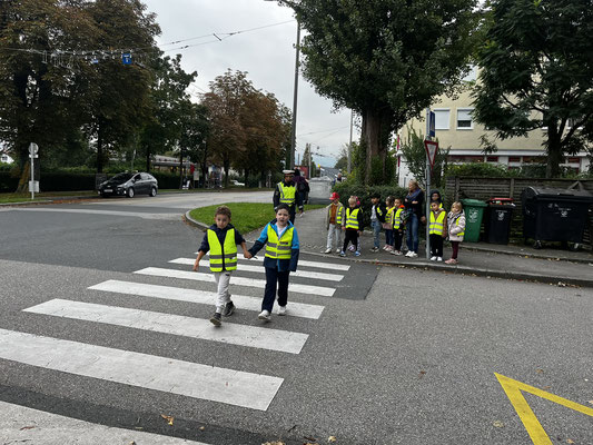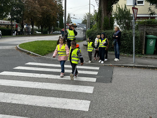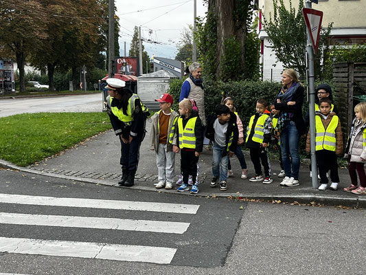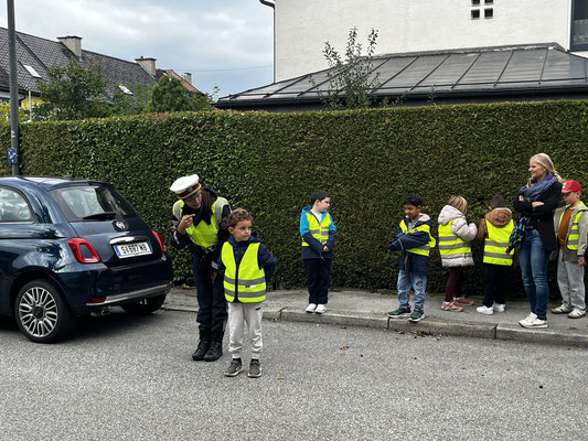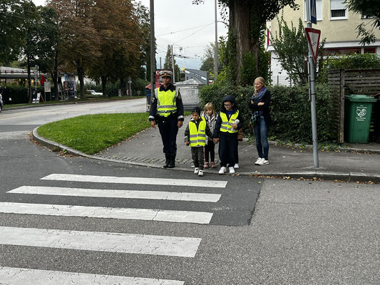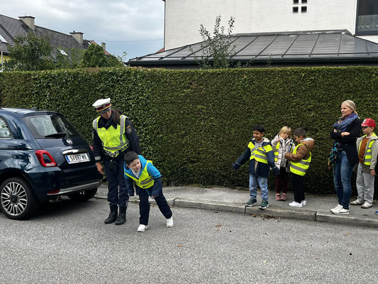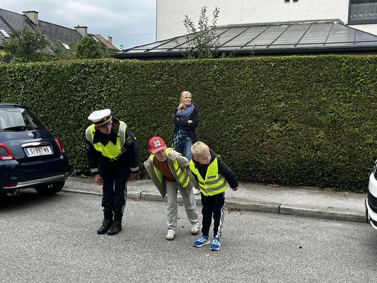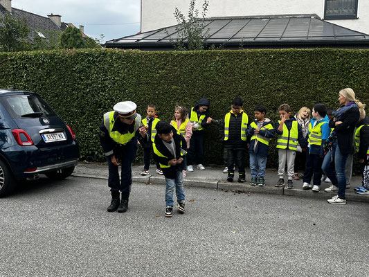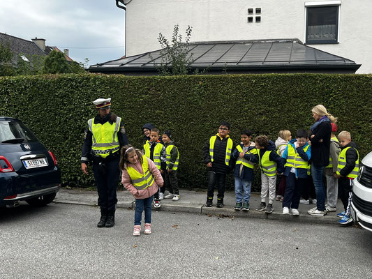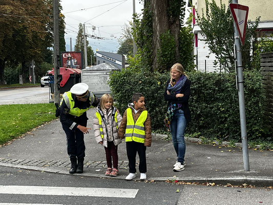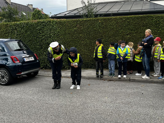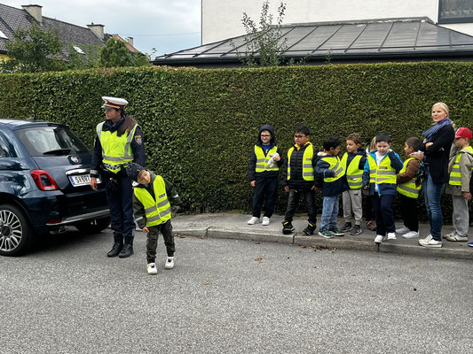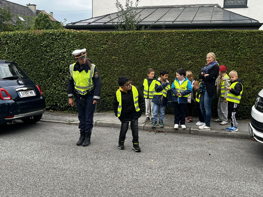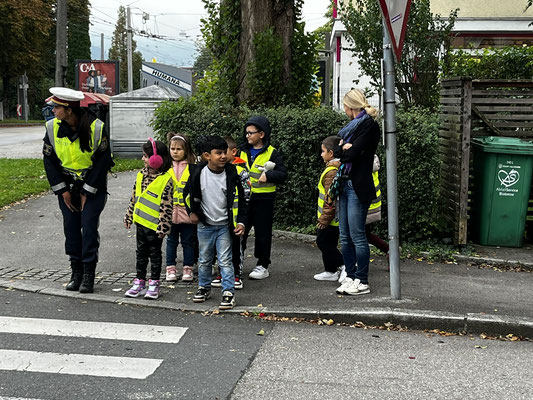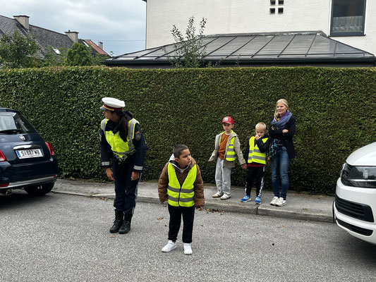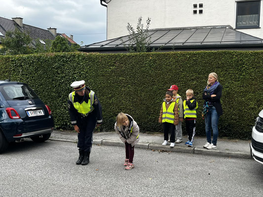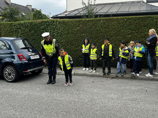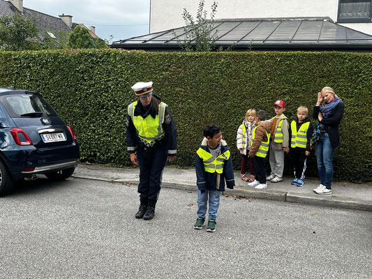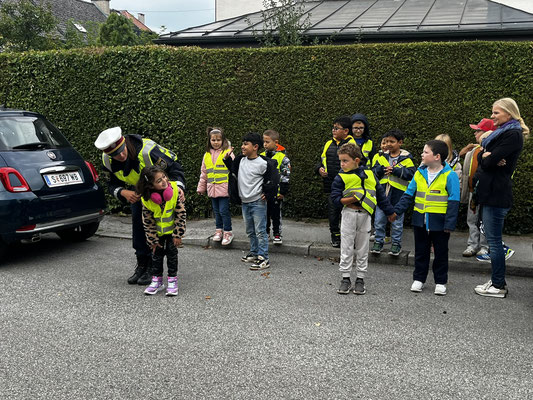 Am 29.9.2025 hatten wir Besuch von einer sehr netten, jungen Polizistin. Sie zeigte und übte mit uns das richtige Überqueren der Straße, machte uns auf Gefahren aufmerksam und beantwortete geduldig unsere Fragen.